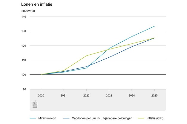 De stijging van het minimumloon over de afgelopen vijf jaar is sterker dan zowel de cao-lonen als de inflatie. In 2025 lag het minimumloon op index 133,2 (2020=100), tegenover 125,1 voor cao-lonen en 125,2 voor de consumentenprijsindex. De sterkste stijging vond plaats in 2023, toen het minimumloon met ruim 10 procent werd verhoogd, deels als gevolg van een eerdere beleidsafspraak om werken financieel aantrekkelijker te maken en deels vanwege de hoge inflatie.