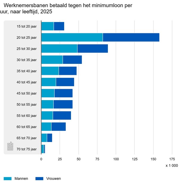 In 2025 telde Nederland gemiddeld 610 duizend werknemersbanen met een uurloon dat maximaal 5 procent afwijkt van het minimumloon. Deze zogenoemde minimumloonbanen vormen 6,7 procent van alle werknemersbanen, blijkt uit cijfers van het Centraal Bureau voor de Statistiek (CBS) in De arbeidsmarkt in cijfers 2025. Ten opzichte van 2024 daalde het aantal minimumloonbanen met 6 duizend.