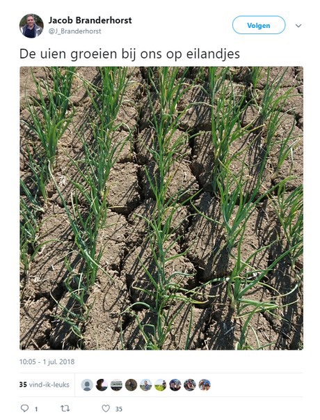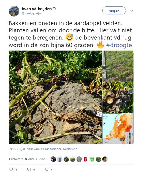 Het is droog in Nederland, in mei was er een warmte record, juni was een van de 10 droogste sinds 1901 en ook juli is zeer warm en droog begonnen. De zomer van 2018 behoort sinds deze week in elk geval tot de 5 procent droogste zomers ooit gemeten en het KNMI ziet 'voorzichtige aanwijzingen' dat de kans op droge zomers in de toekomst groter wordt. "We zitten rondom de langste dag dus dat betekent extra lange dagen met veel zon en hoge temperaturen waardoor droogte nu veel meer impact heeft dan bijvoorbeeld midden augustus droge dagen", vertelt een handelaar. Hij staat regelmatig met telers op de velden en ziet dat de droogte in akker- en tuinbouw in Noord en Centraal Europa dramatische vormen begint aan te nemen. "Planten staan in de overlevingsmodus en niet in de groeimodus. Telers moeten vol aan de bak met beregenen van de gewassen, maar door vrij krachtige droge noordoosten wind verdampt het water weer snel. Ik verwacht dan ook dat de productprijzen zullen gaan stijgen, zeker kijkend naar de 14-daagse weersvoorspelling waarin de droogte blijft aanhouden en de windrichting niet verandert."