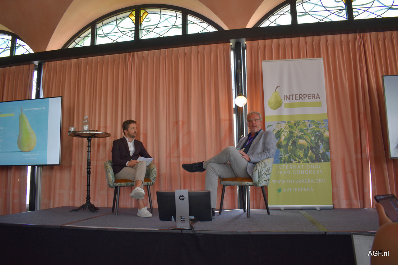 Dagvoorzitter Mark Wijsman en André Boer van Superunie in gesprek over onder andere ruimte voor nieuwe peren in het supermarktschap: alleen als ze echt anders zijn dan Conference, een goede houdbaarheid hebben en er aantrekkelijk uitzien.