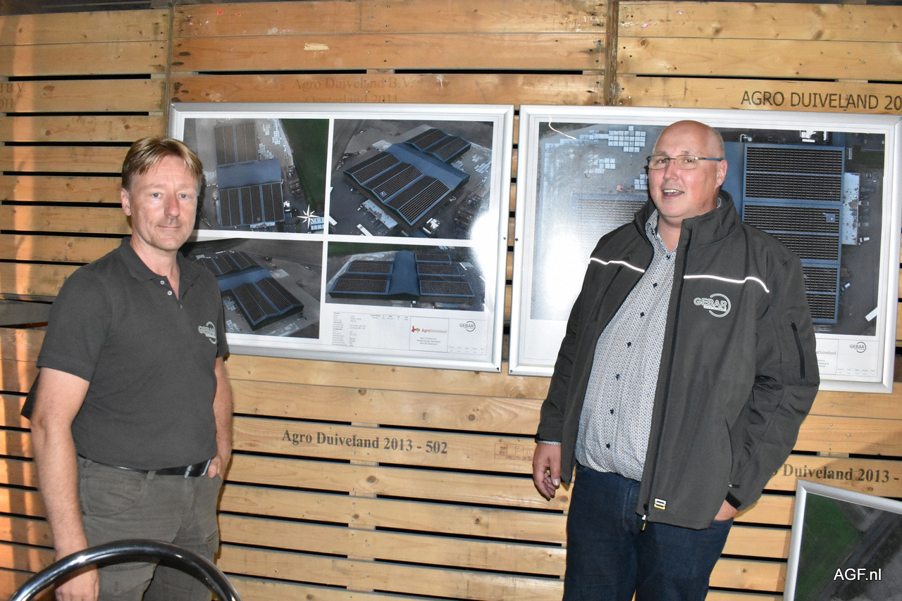 Michael van de Waal en Remko Dijksman van Gebar mogen bij Agro Duiveland 2.000 zonnepanelen op het dak installeren