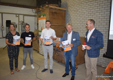 Friederike van der Boon en Chris Matthijsse van Takii. Tussen hen in de bekende bollentrui waarmee zo'n 20 deelnemers blij werden gemaakt die meededen aan het Takii Tourploegspel op onze site