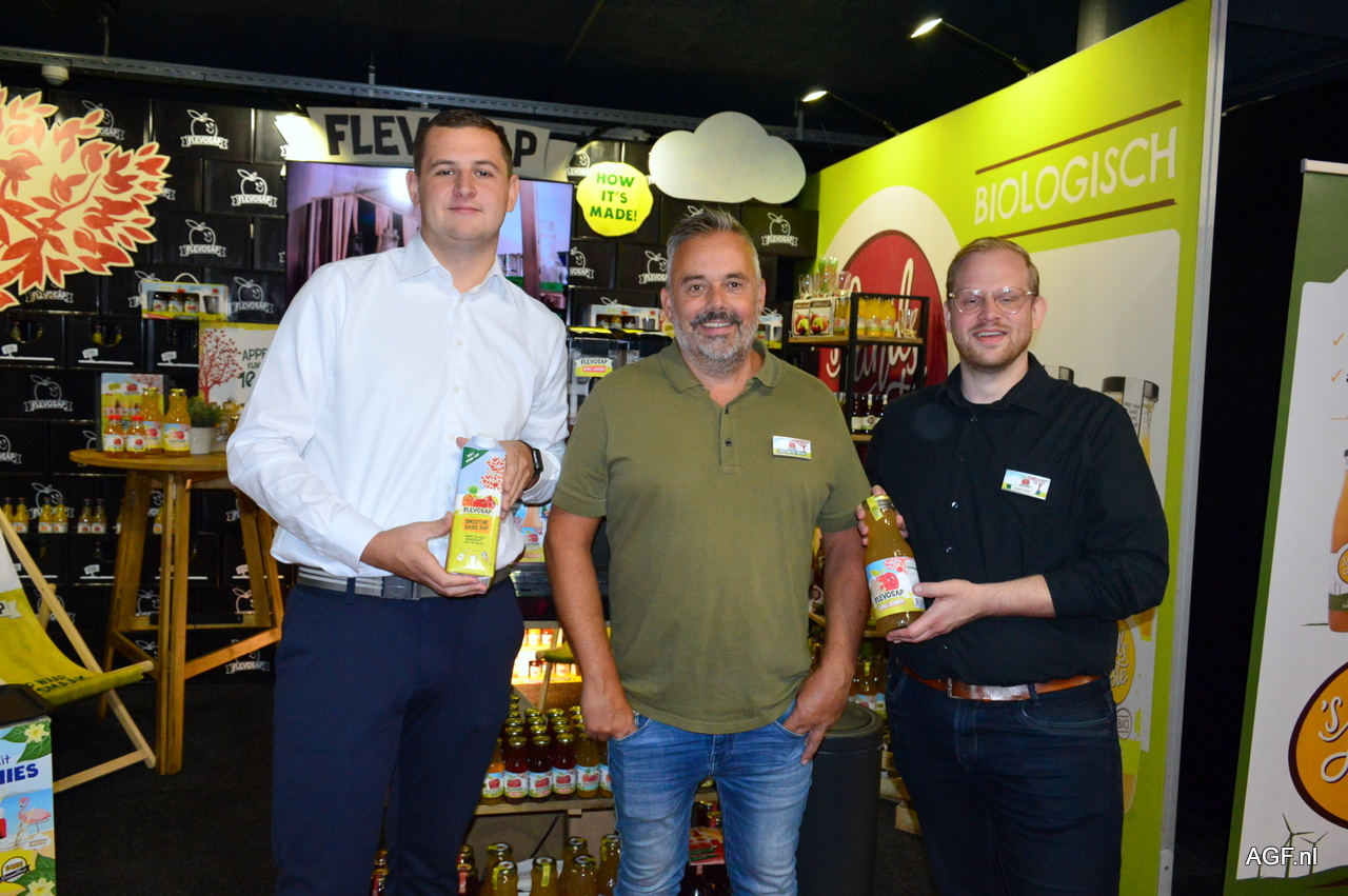Jinse Lemmens, Cees-Jan de Bruijn en Jasper Vogel van Flevosap/Smoothieshop. Flevosap heeft een nieuwe smaak: Appel/Gember en een lijn Basis Smoothie Sap.