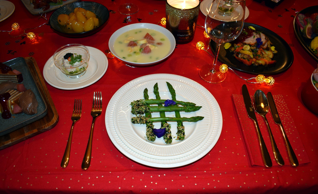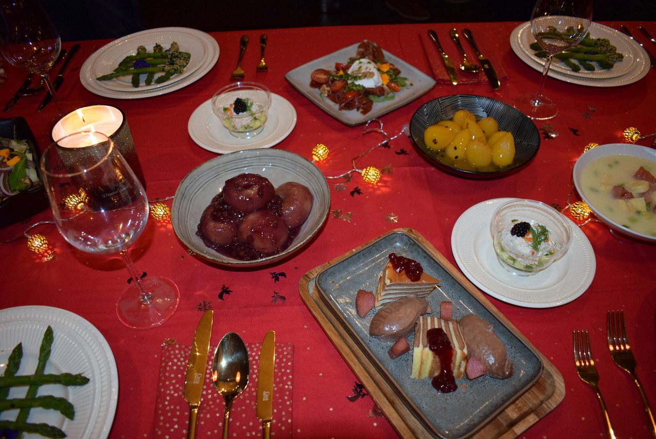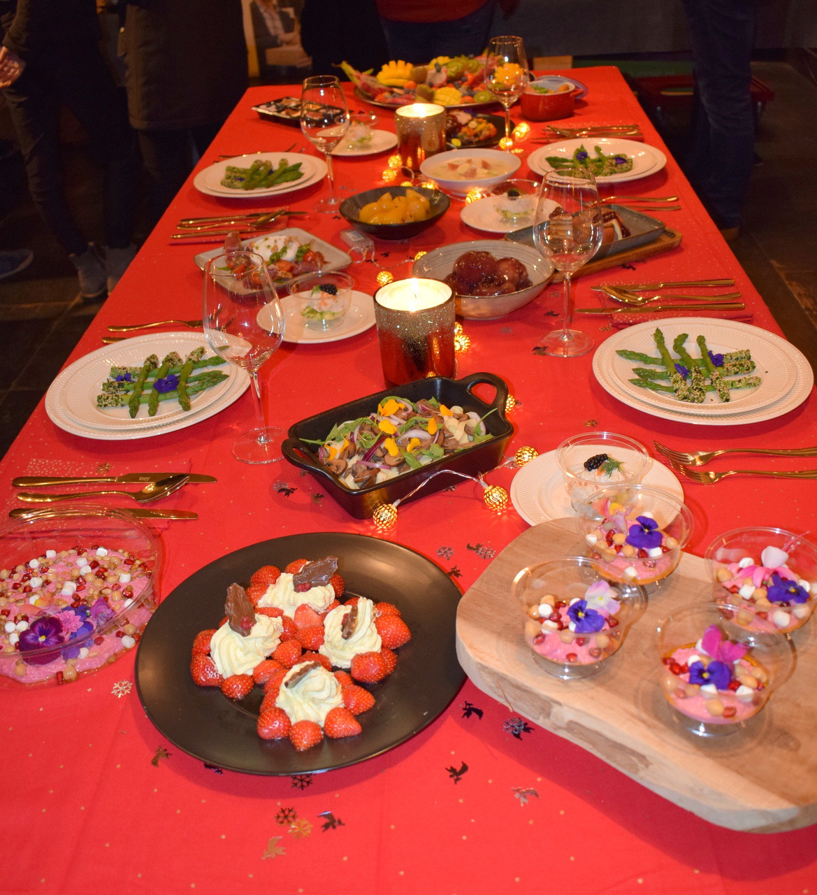 Op een gedekte kersttafel staan voorbeelden van eenvoudig klaar te maken gerechten met een luxe uitstraling