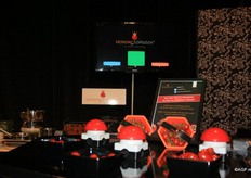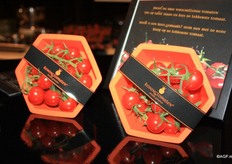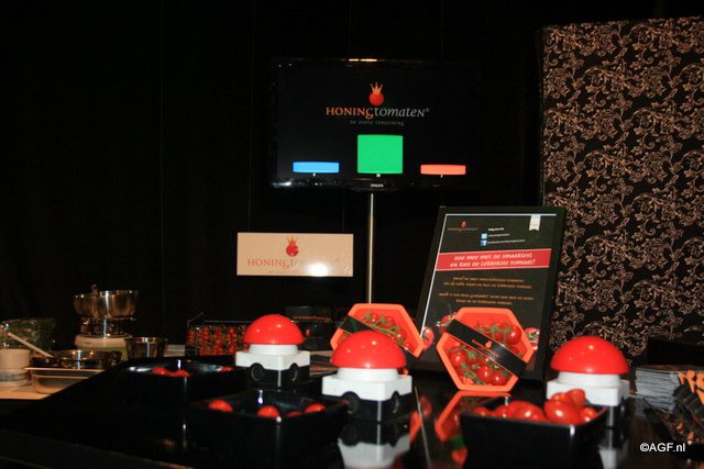 Bezoekers konden deelnemen aan de smaaktest. Op de voorgrond drie verschillende soorten tomaten, met op de achtergrond de uitslag van de test. De honingtomaten (midden) blijven toch erg populair.