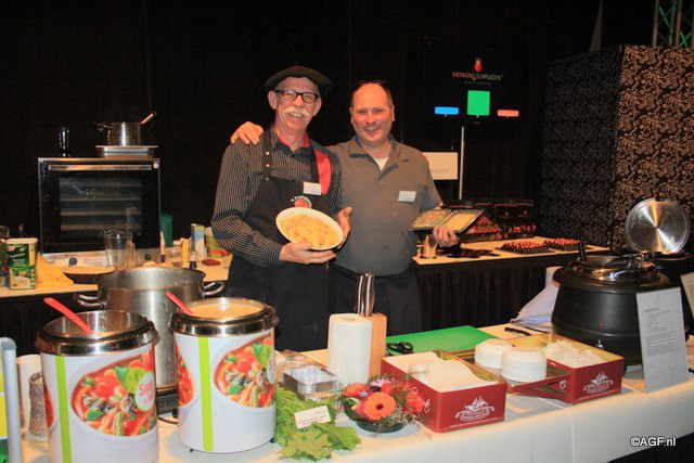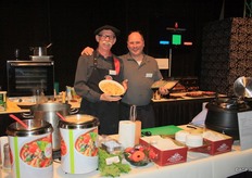 Gerard Peeters van groente- en fruitspecialist 'Het Trostomaatje' met zijn zelfgemaakte soepen op de voorgrond en detaillist Francois Wolfs uit Maastricht met zijn zelfgemaakte ragoûts.