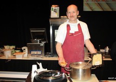 Gerard Peeters laat de bezoekers zijn soepen proeven. Twee hiervan zijn de asperge crème soep en de bloemkool- broccoli crème soep.