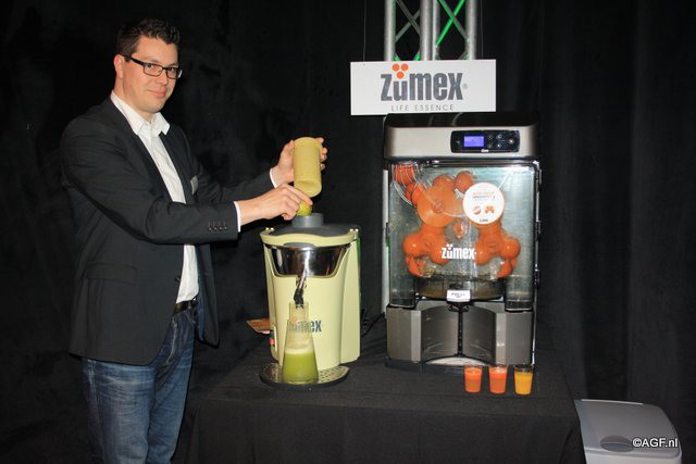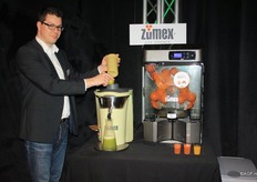 Niels Rooswinkel van Zumex laat de sapcentrifuge zien, een vruchtenpers voor alle soorten groenten en fruit.