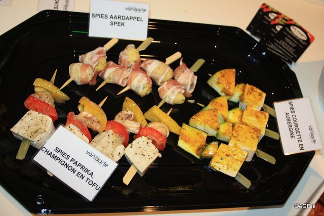 Ook bieden zij bbq schotels aan, Hier drie voorbeeldspies met aardappel, courgette/aubergine en paprika/champignon/tofu.
