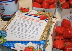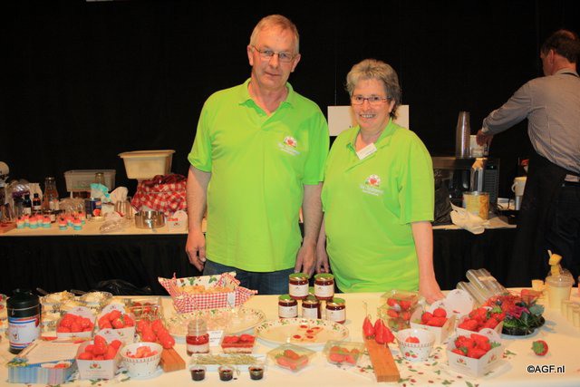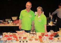 Huub en Maria van Enckevoort Aardbeien zijn trots op hun nieuwe ras. Op de voorgrond allerlei aardbeienproducen zoals jam en monchou taart.