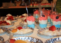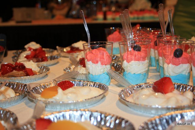 De bekertjes is bavarois met kleurstof voor Koninginnedag. Op de voorgrond verschillende nagerechten met vers zomerfruit.