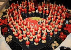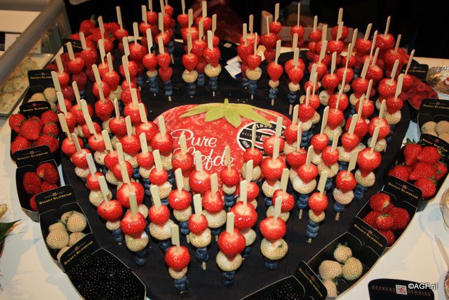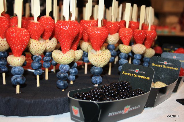 De rood-wit-blauwe fruitprikkers, in het midden de ananasaardbei.