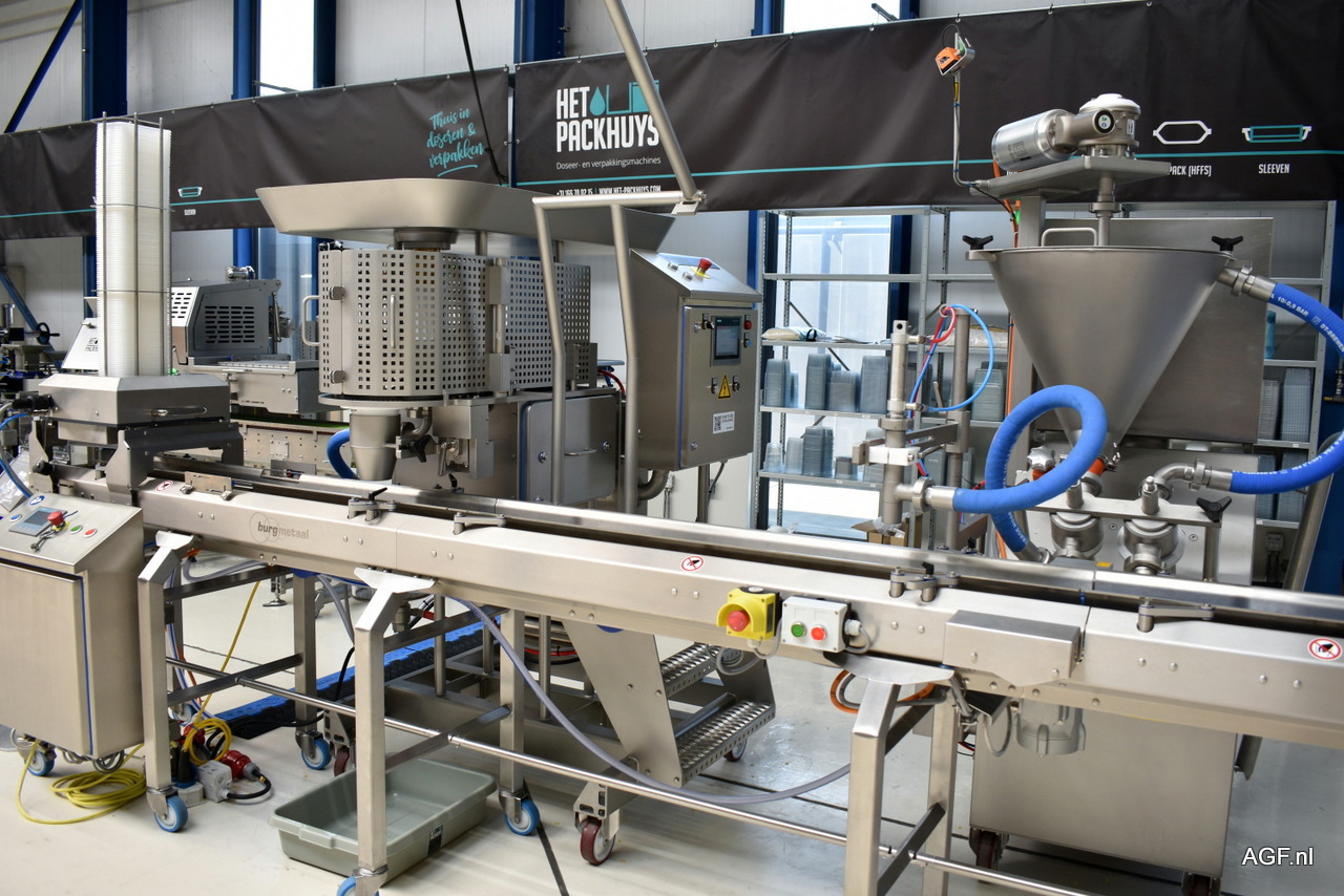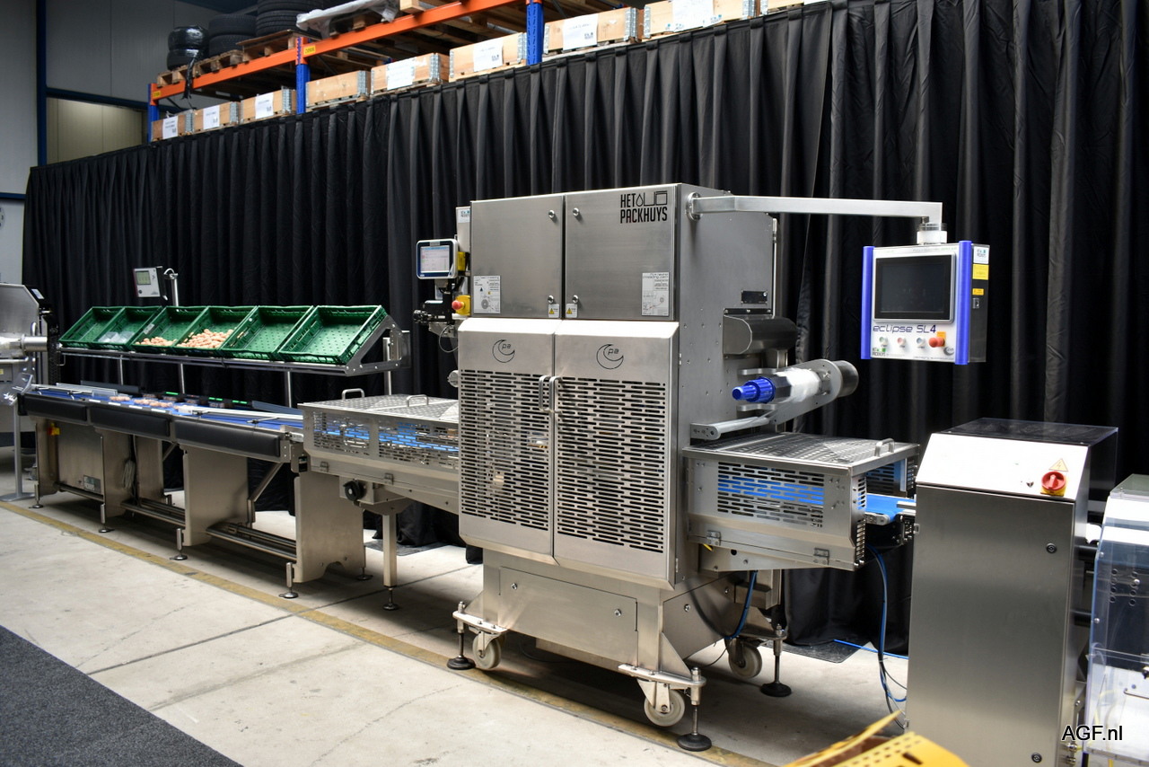 De machine staat opgesteld in een complete lijn in combinatie met een topsealmachine en casepacker