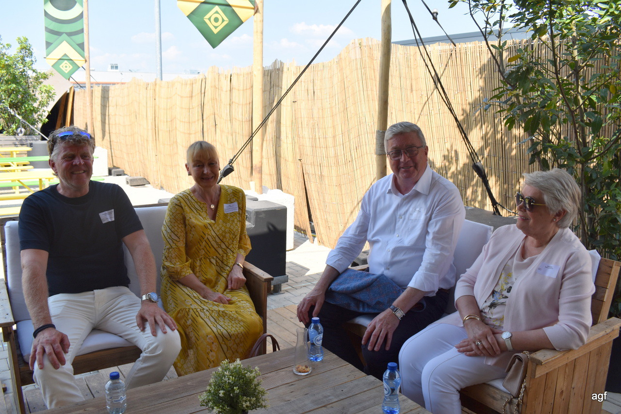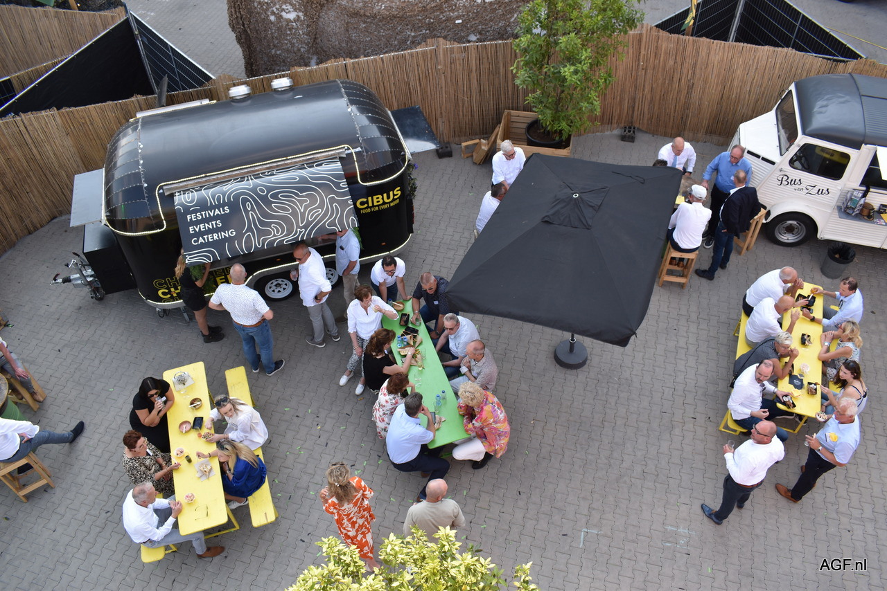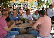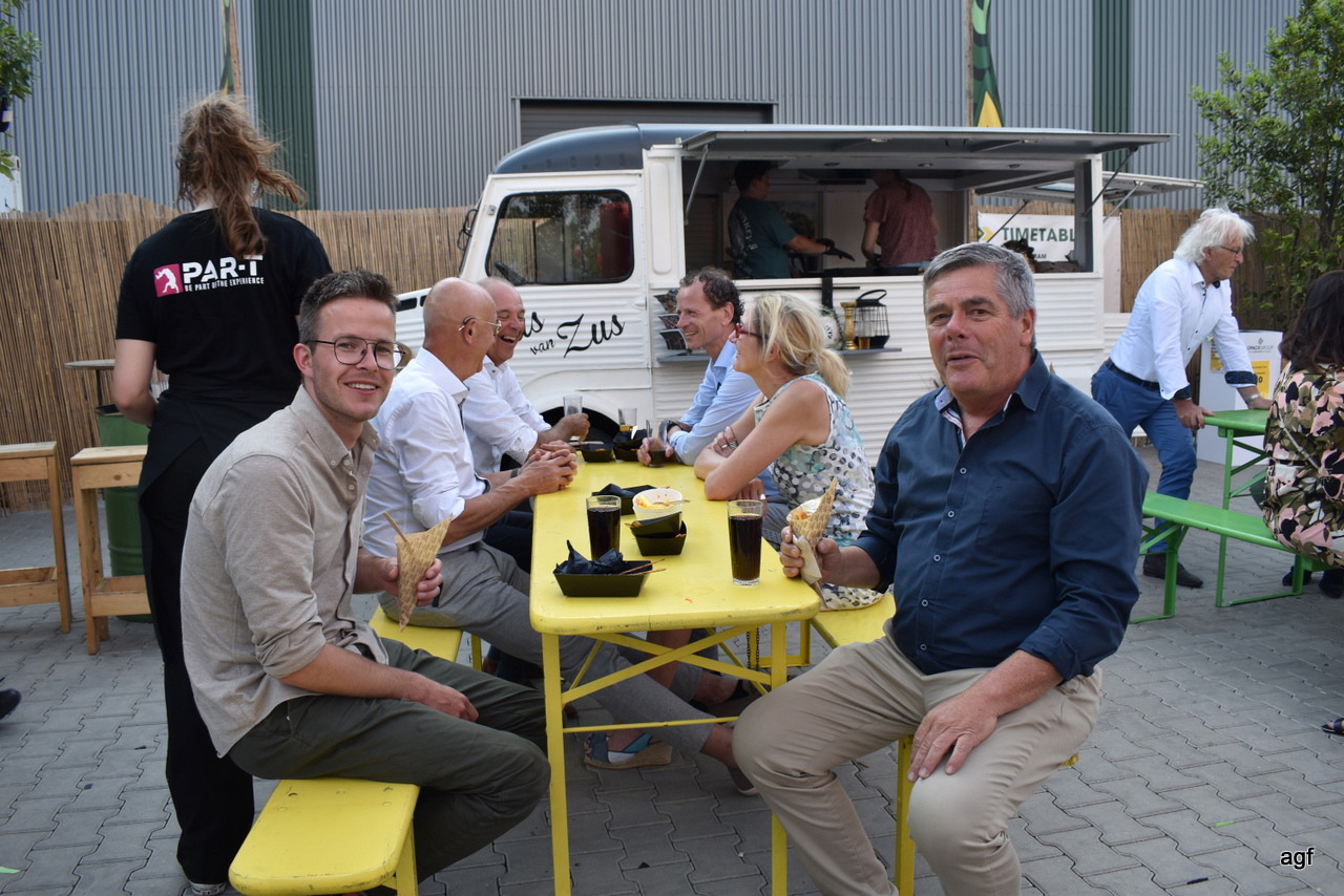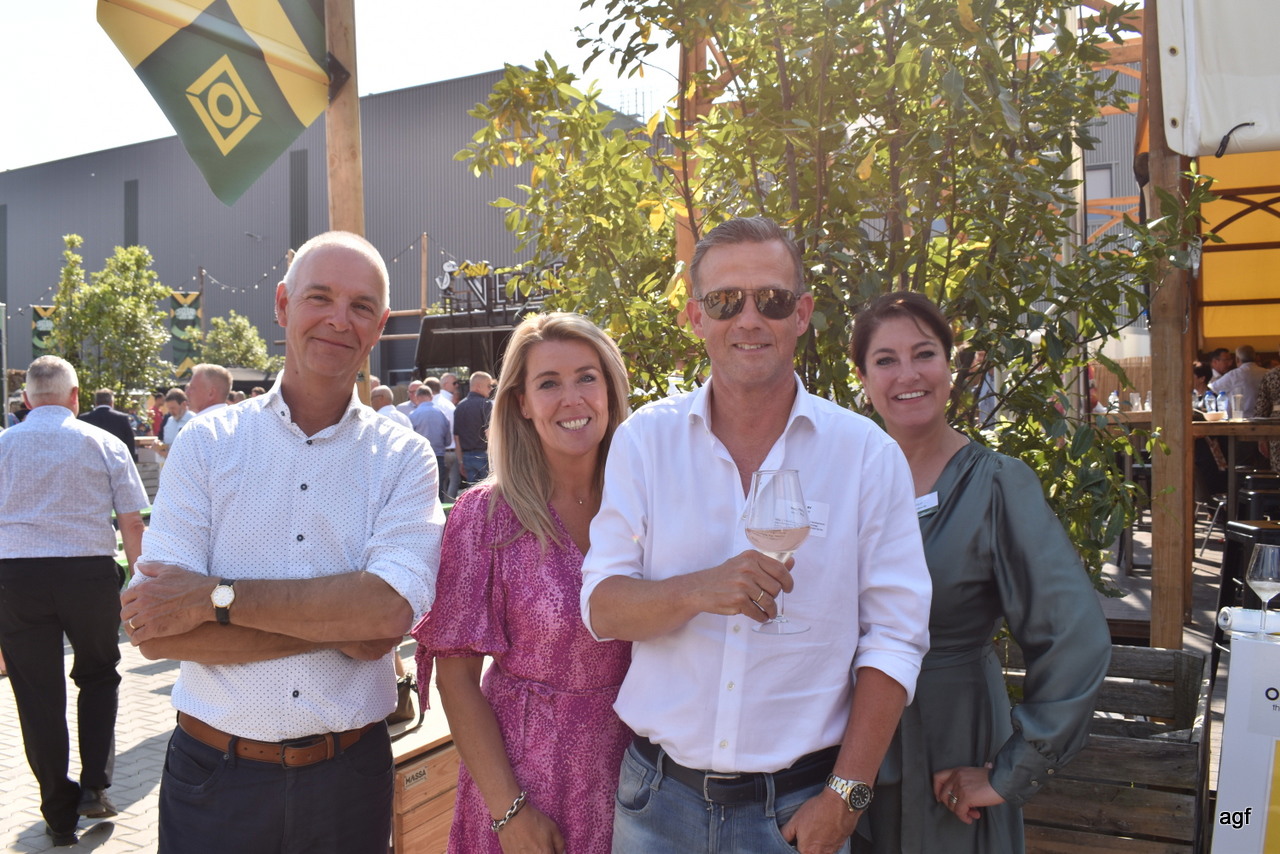 Gezellig aan het bijpraten, Leo Gouda en Goof van der Kolk van Elgo Eethen, Karin en Huib van Hemert, van Huib van Hemert Bestrating en Grondewerk.