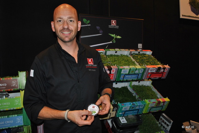 Eric Miete van Koppert Cress presenteerde trots de nieuwe BlinQ Blossom®. Een robuust sappig kruid en met zijn kristalachtige voorkomen een echte blikvanger in het assortiment.
