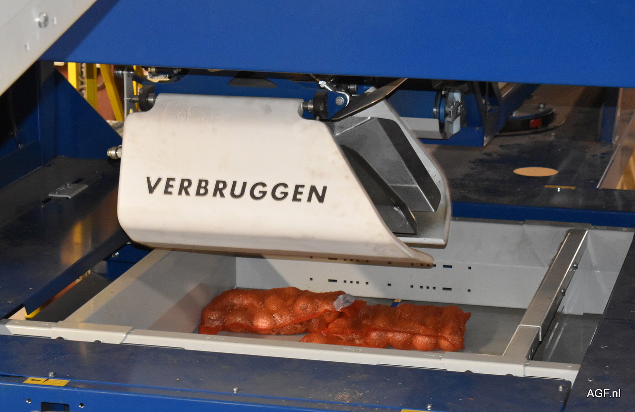 Een baal uien is via de aanvoerband in de manipulator gelegd. De machine legt de zak neer volgens het vooraf ingestelde patroon.