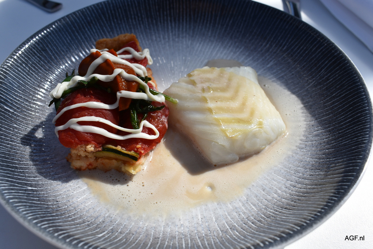 Voor de liefhebbers: Zacht gevulde kabeljauw, taartje gevuld met Looye Joyn tomaten, spicey John tomaat en zilte groentjes met specerijenjus