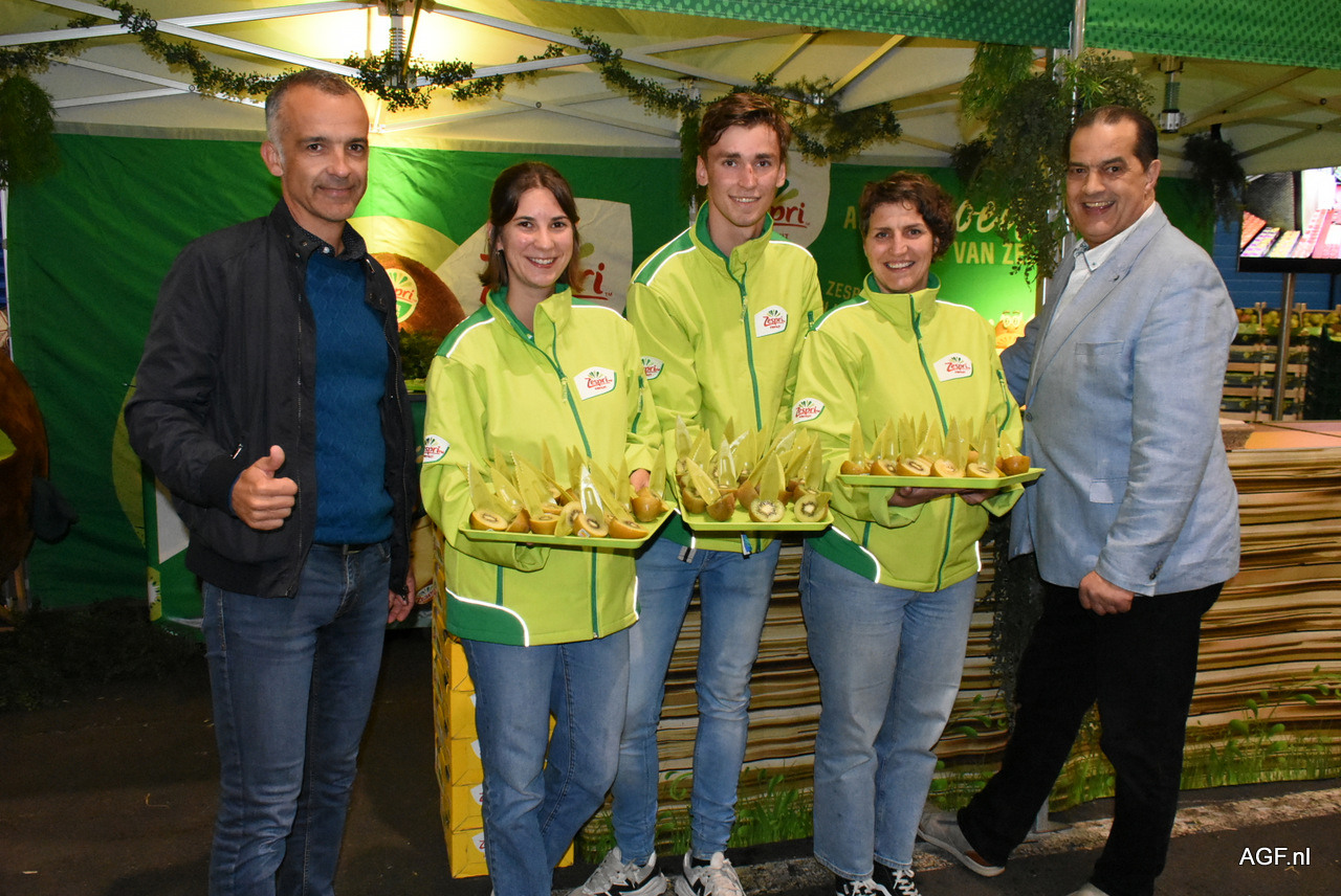 Jochen Wyns en Ton Theunissen (Zespri) boden met het team verschillende hapjes op basis van kiwi aan