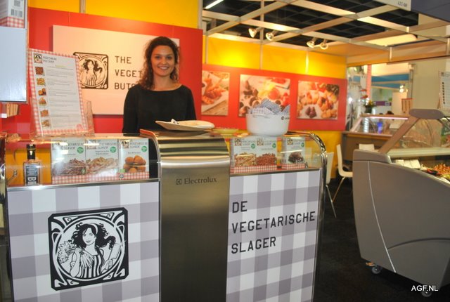 Cher Glaser van de vegetarische slager. Zij presenteerde onder andere de vleesvervangers op basis van groenten.