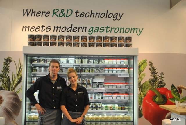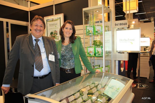 Peter van Asten en Liesbeth Elsen van HerbaFrost bij de diepvrieskruiden. Nieuw dit jaar waren de grotere kruidenporties die makkelijker worden verwerkt in soepen en sauzen. Herbafrost is één van de marktleiders in de wereld van IQF kruiden.