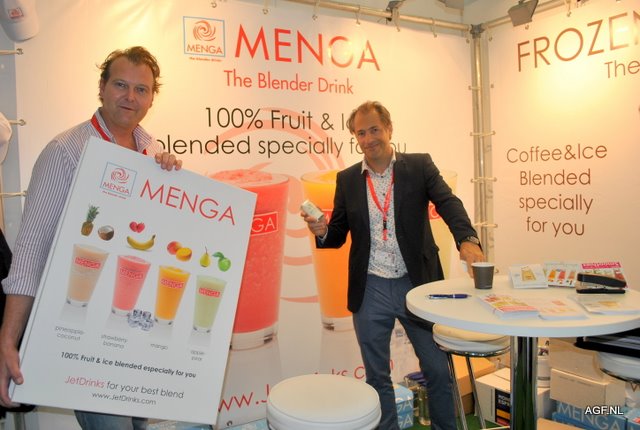 Jelle Schmidt met Dmitri Peters van JetDrinks. Menga is een makkelijk te bereiden smoothie speciaal ontwikkeld voor de horeca. Menga smoothies bestaan uit puur vruchtenpuree, groene thee, vitamine C en bevatten géén toegevoegde suikers of kunstmatige zoetstoffen.