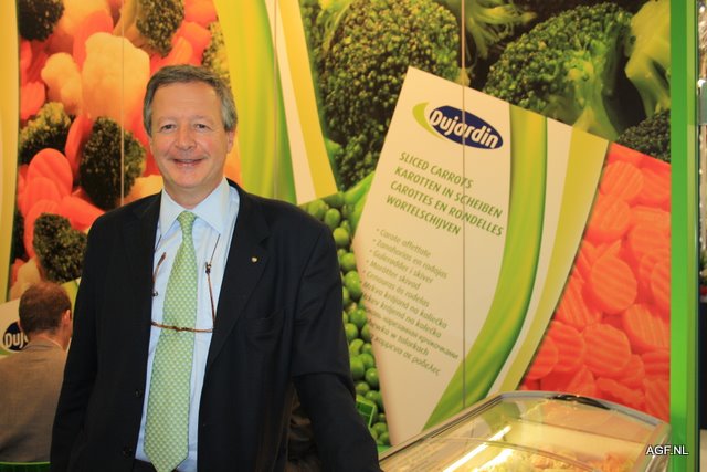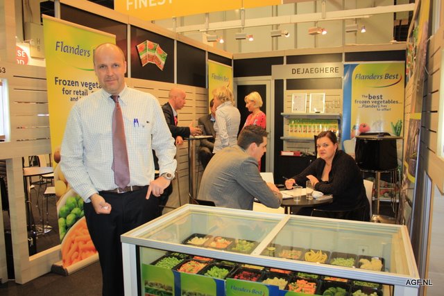 Homifreez en Horafrost deelden dit jaar een stand. Ze hebben beiden een gamma van diepvriesgroenten. Op de foto: Frank Hoflack van Horafrost. Hij geeft aan dat diepvriesgroenten zeer duurzaam zijn omdat ze 24 maanden houdbaar zijn én omdat de consument precies gebruikt wat ze nodig heeft.