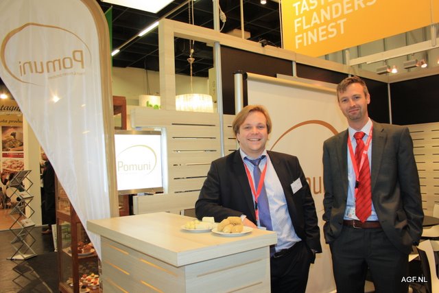 Ook Pomuni was aanwezig met haar gamma bevroren aardappelproducten. Links Ben Muyshondt en rechts Raf Sels