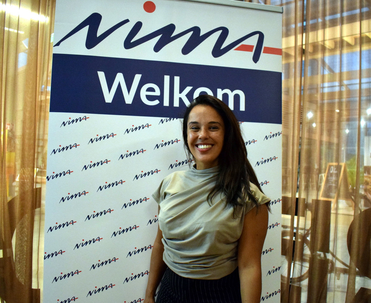 Charida Dorder van de AI Marketing Academy poseert voor de banner van opleider Nima