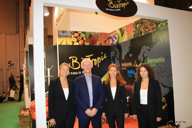 BioTropic had dit jaar voor het eerst een stand in Fruit Attraction. Tweede van Links: Ronald Vianen met Pernille Dynesem (links) en Spaanse vertegenwoordigers van de bio groenten- en fruitleverancier.
