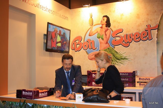 Het merk Bon Sweet van de ananassen. Op de voorgrond directeur van CoolFresh Spanje Paco Serrano (links) en een klant