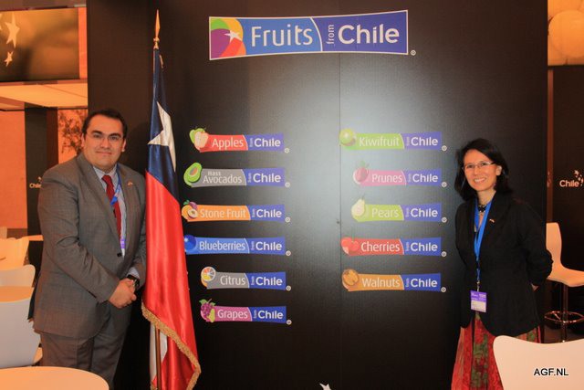 Fruits from Chile was aanwezig op de beurs. De vorst in het land is een catastrofe voor de fruitsector. Links Christian Carvajal van Asoex en rechts Lorena Sepulweda van ProChile. Volgens Christian zal de komende dagen een duidelijker beeld komen van de situatie.