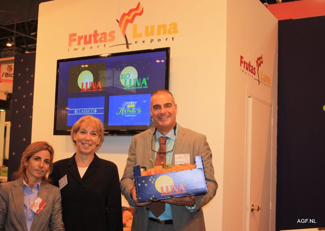 Lachende gezichten bij Frutas Luna, importeur en exporteur. V.l.n.r.: Miriam Dena, Esther Kamphuis en Keees Havenaar. Op de achtergrond de merken die Frutas Luna levert. Kees geeft aan dat deze beurs zeer interessant voor hen is net voor het Spaanse seizoen
