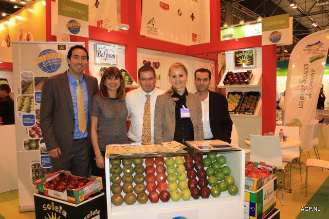 Het team van het Franse bedrijf Distrimex, importeur en exporteur van groenten en fruit. V.l.n.r.: Victor, Nathalie, Marc, Olga en Charles. Eén van hun merken is Bel'pom