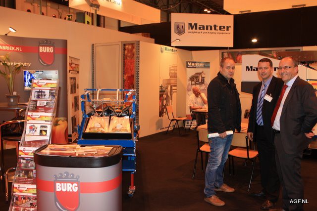 "Manter en Burg Machinefabriek deelden een stand. "Een supercombinatie aldus Arjan en Willem. Helemaal rechts Arjan van Burg, Naast hem Albert en een klant. Helemaal links achterin: Willem de Jong van Manter. Manter heeft sinds dit jaar een vestiging in Spanje"