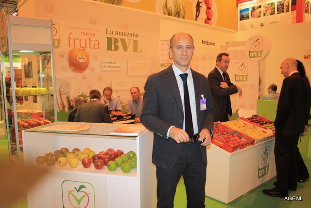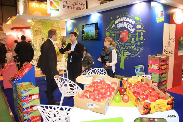 Ionis Fotiadis, de exportmanager van het Franse bedrijf BVL. Het bedrijf staat voor vijf coöperaties en 120 telers in Frankrijk met een totaal areaal van 1.700 hectare. Het zijn met name appelen waaronder het bekende merk Pink Lady. Rechts de directeur van het bedrijf in gesprek en links Kris Wouters van Wouters Fruithandel op bezoek in de stand