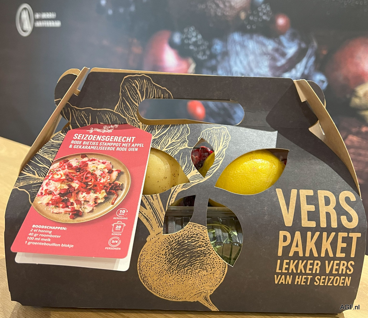Verspakket: seizoensgerecht met rode bietjes stamppot met appel en gekarameliseerde rode uien.