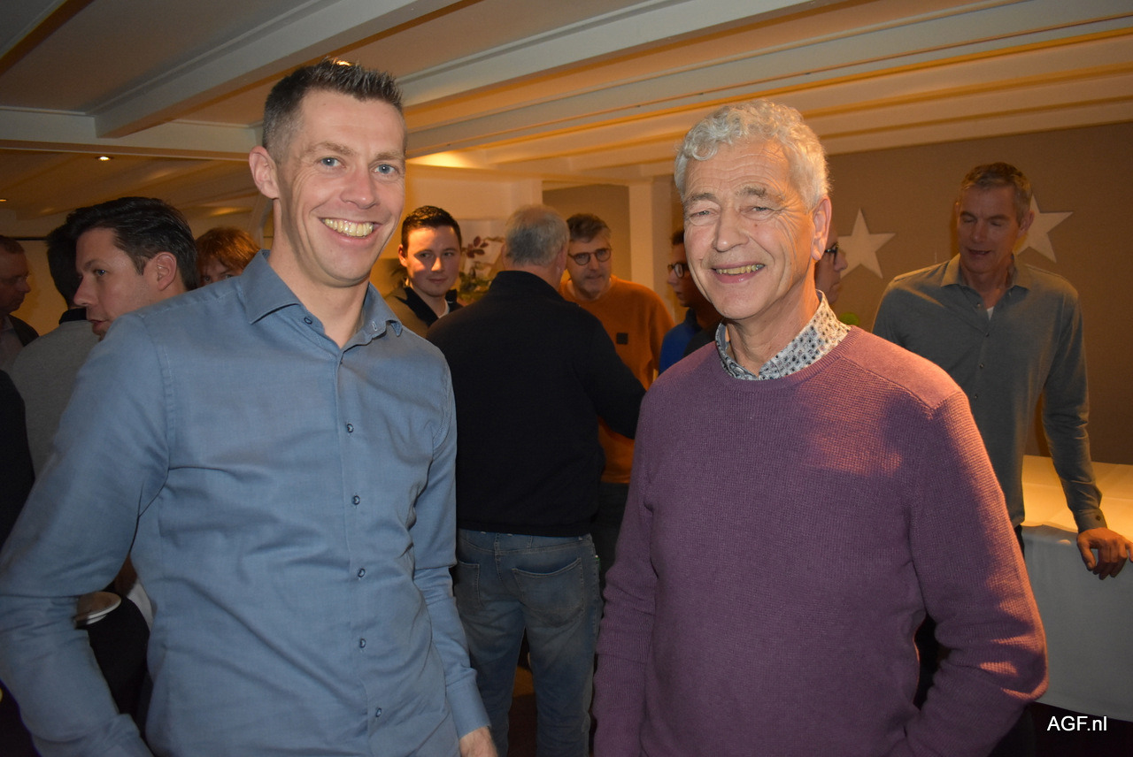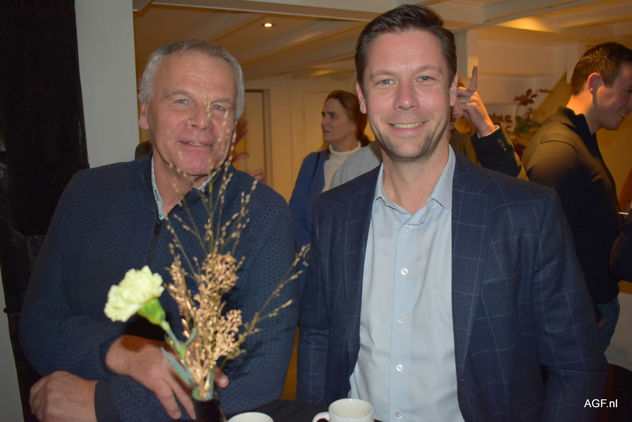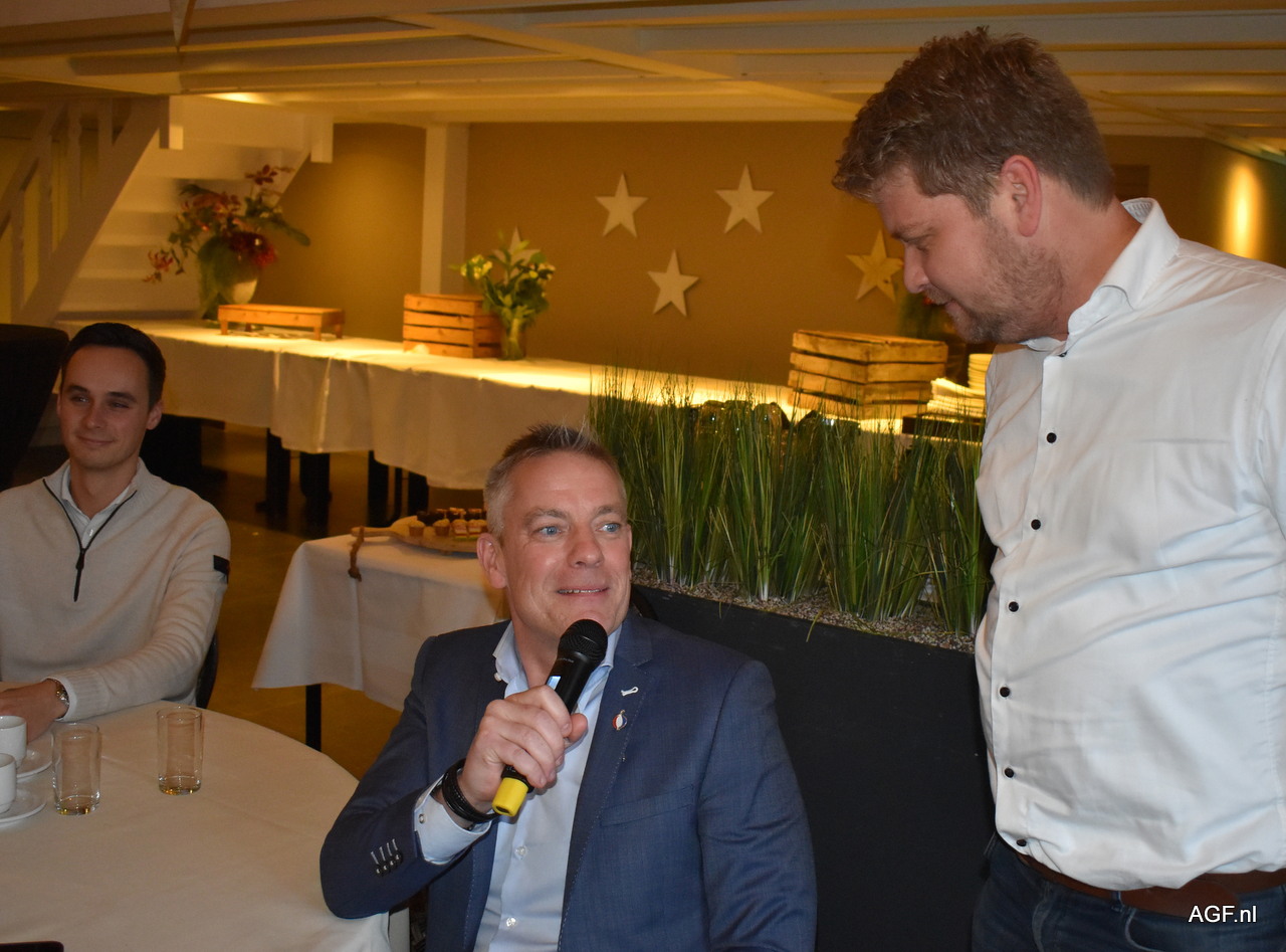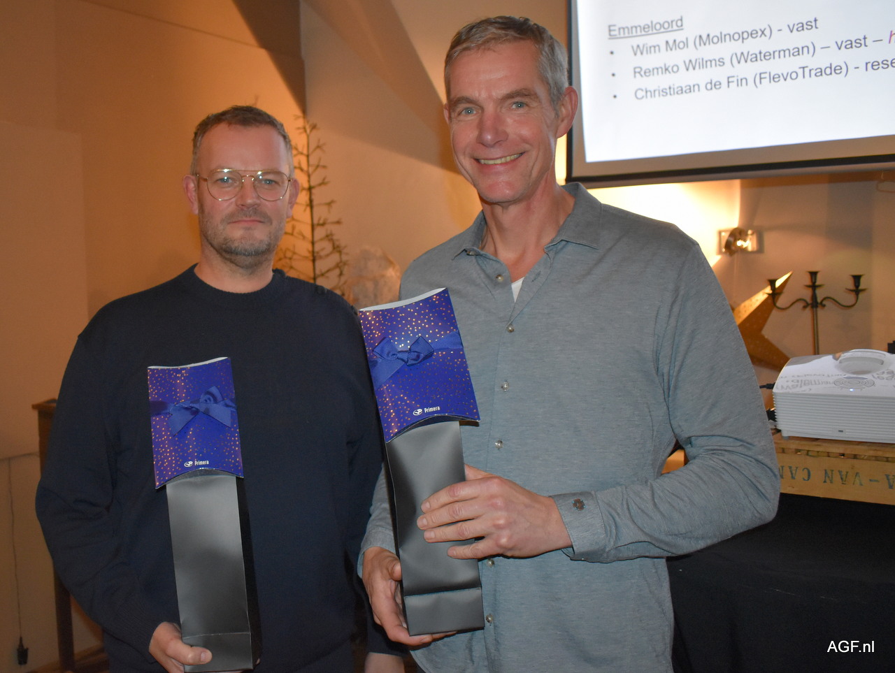 Beursnoteerders Emmeloord Wim Mol van Molnopex en Wim Waterman van Waterman Onions die het bedankje in ontvangst nam voor Remko Wilms.
