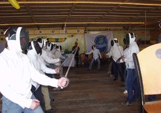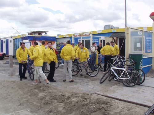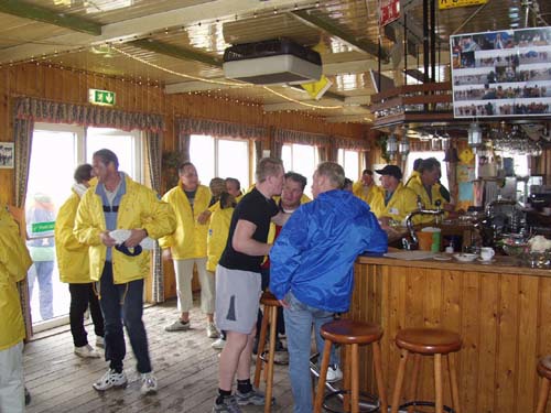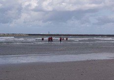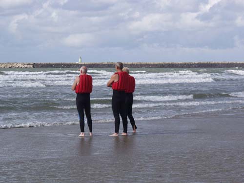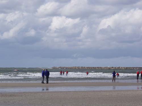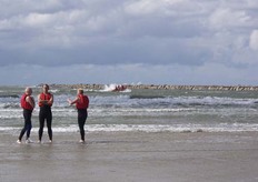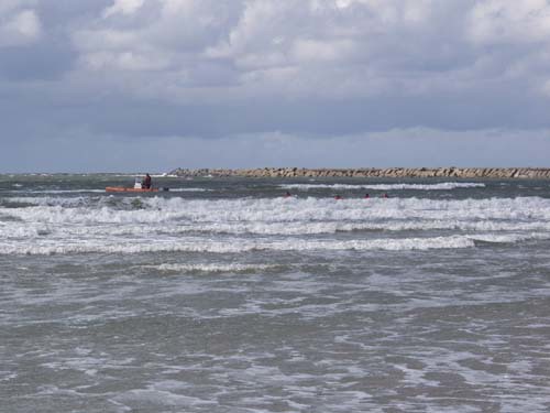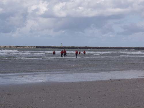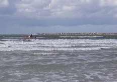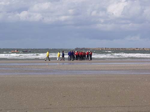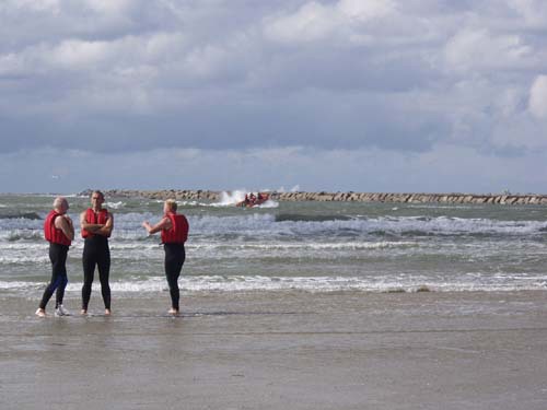 Nog even overleggen dan maar... Op de achtergrond stampt de rubberboot op de golven.