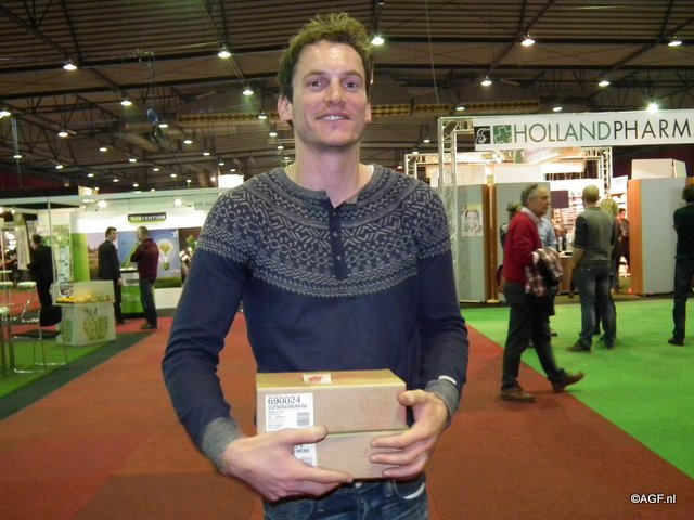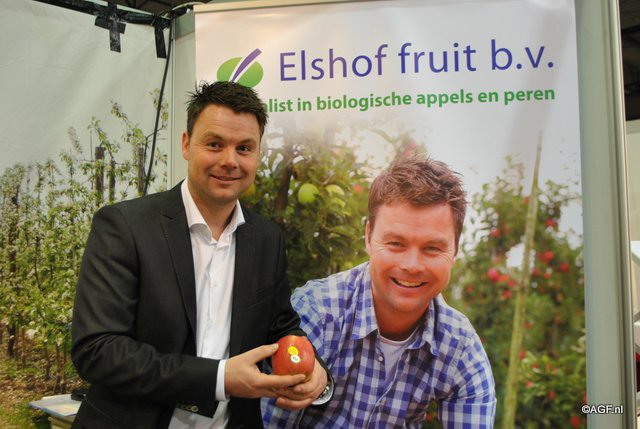 Robert Elshof met zijn beursprimeur de biologische lola appel.