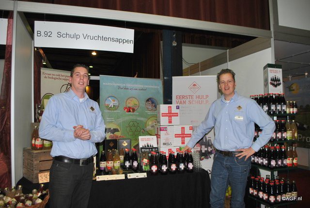 Elger Wiersma en Sander van Leeuwen van Schulp Vruchtensappen. Bezoekers konden onder andere de sappen proeven van de nieuwe lijn gericht op gezondheid.