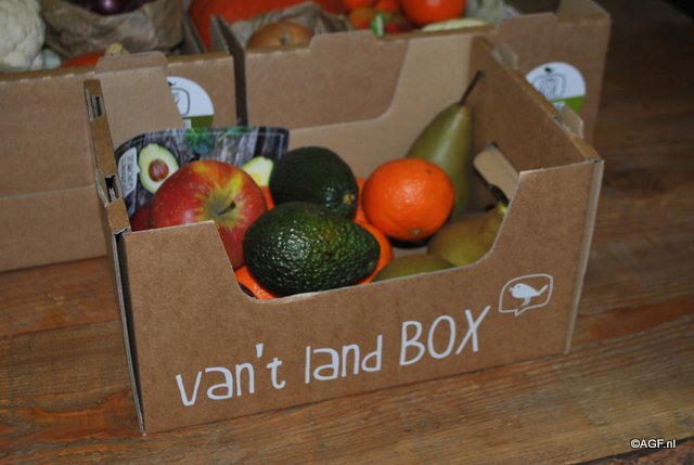 Op de stand van De Zaai-ster, de van't land box: Wekelijks een nieuw pakket biologische groenten of fruit, met een recept en het verhaal van de teler en van het land.