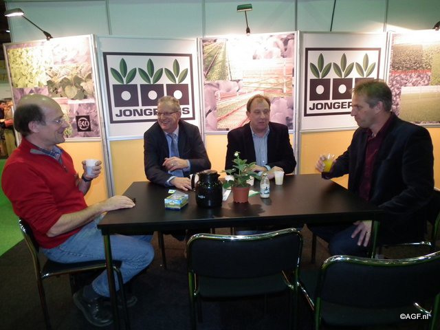Geanimeerde gesprekken aan tafel bij Plantenkwekerij Jongerius: Bart Willems (Warmonderhof), Wim Huijgens, Thijs Koning en Herman Boon.