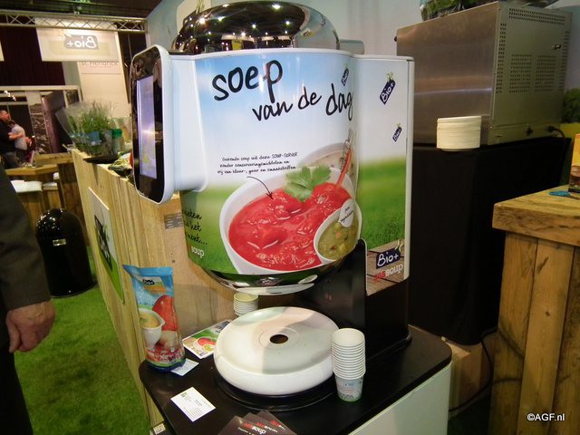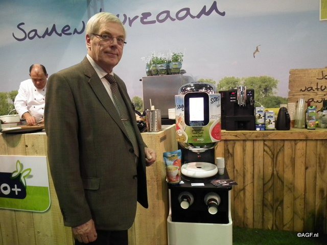 Walter Rompa van Four Seasons Food met de nieuwe soepautomaat van Bio+.