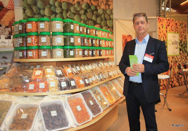 Paul van Puyvelde van Quality Nuts tussen zijn producten. Quality Nuts is een jong bedrijf, dat in 1989 van start ging met de verkoop van noten en gedroogde vruchten.