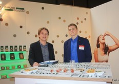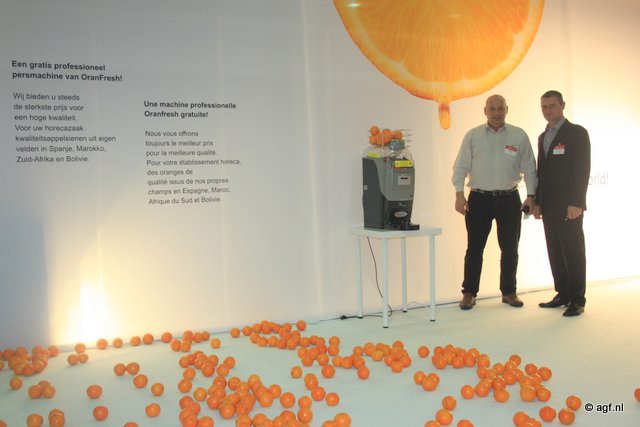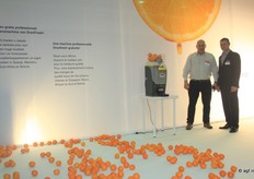 Fran D'herckers van Spabel Oranges (rechts) presenteerde zijn sinaasappelen opvallend. Hij deelde de stand met Yves Norrenberg (links) de leverancier van Oranfresh, de citruspersmachines. De twee bedrijven werken sinds enkele weken officieel samen .