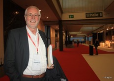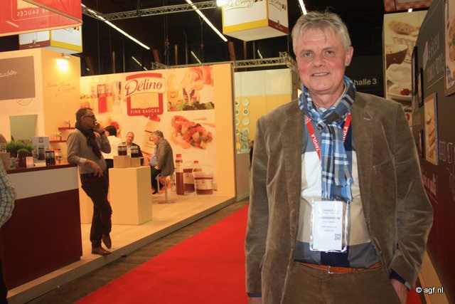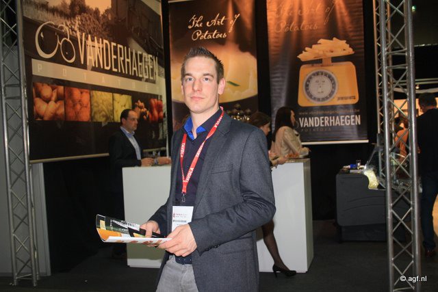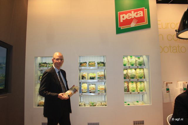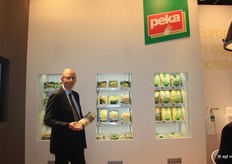 Albert Van der Vlies, Sales- en marketingdirecteur van Peka Kroef bij een deel van het productassortiment. Peka Kroef is specialist in verse, gekoelde aardappelproducten. Het bedrijf presenteerde diverse nieuwe producten zoals de snijdbare gratin.