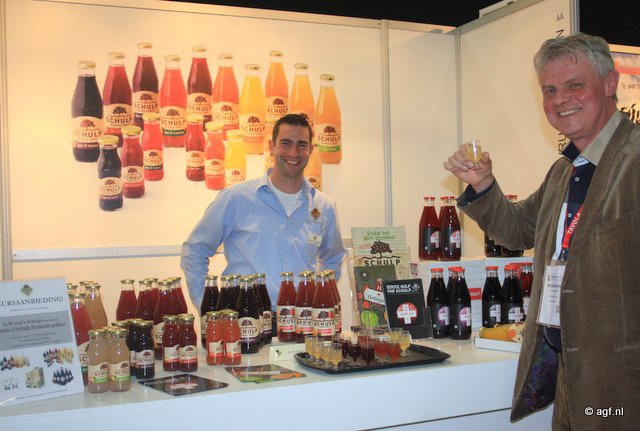 Tony Derwael (rechts) wilde graag een sapje van Schulp proberen. Wilm Koemans (links) van Schulp Vruchtensappen vertelt dat ze sinds kort ook actief zijn op de Belgische markt