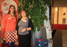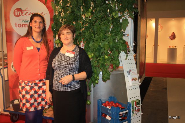 Kelly van Dessel van BelOrta en teelster Marja van Dessel poseren ook graag nog bij de Intense Tomaten. Marja geeft enthousiast aan dat veel horecabedrijven interesse tonen in de niet-lekkende tomaat