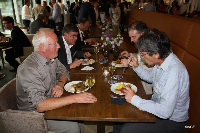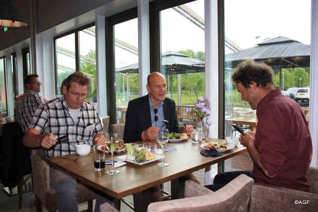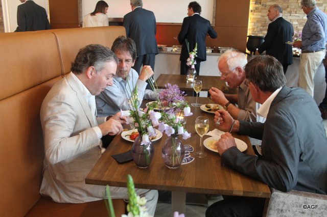 Theo Ammerlaan, Rien van Doorn en Rob Banken happen een bordje leeg