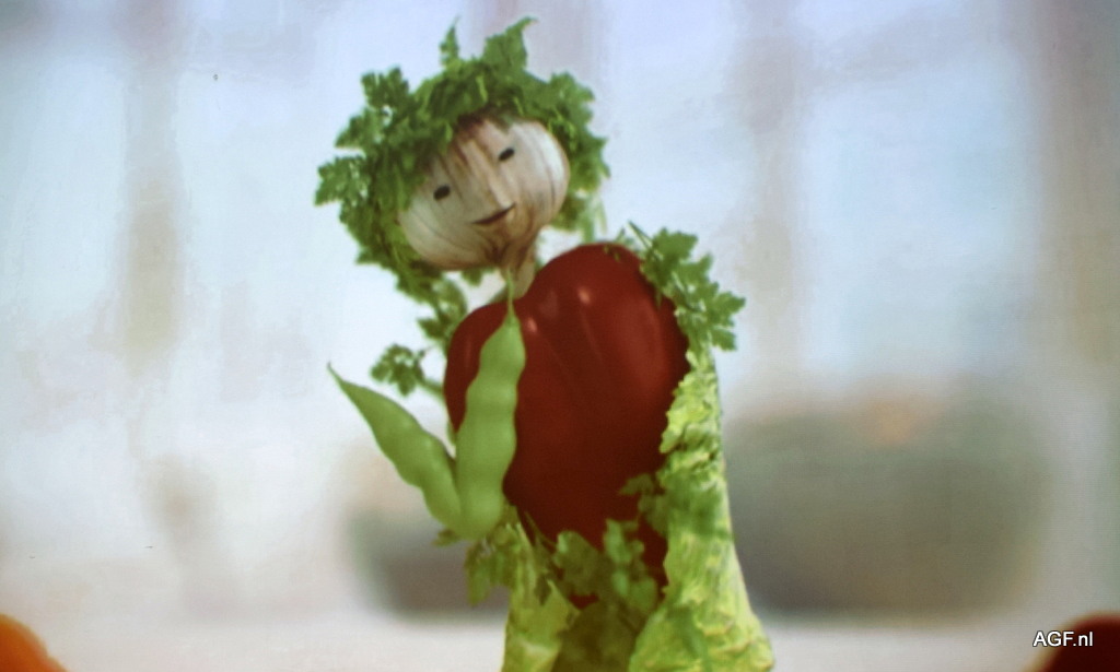 Een dansend groentepoppetje, beeld uit een filmpje over online beleving van Rupert Parker Brady